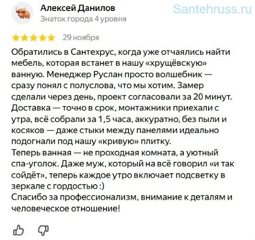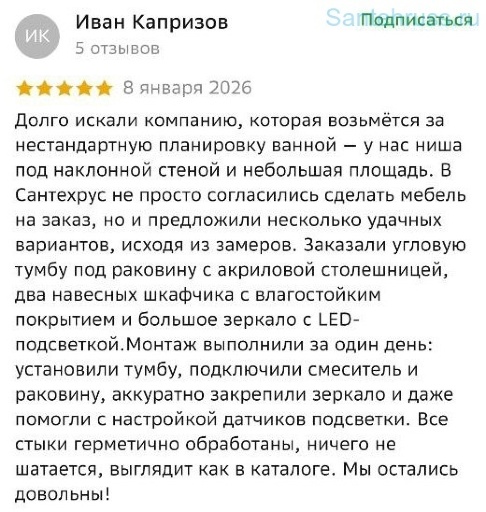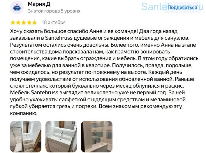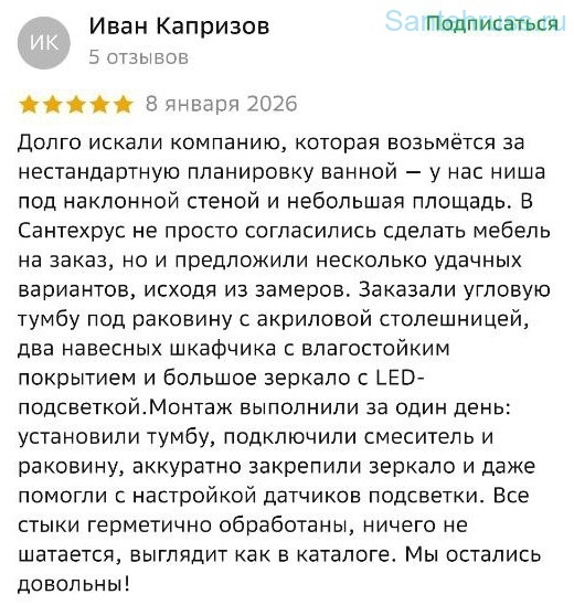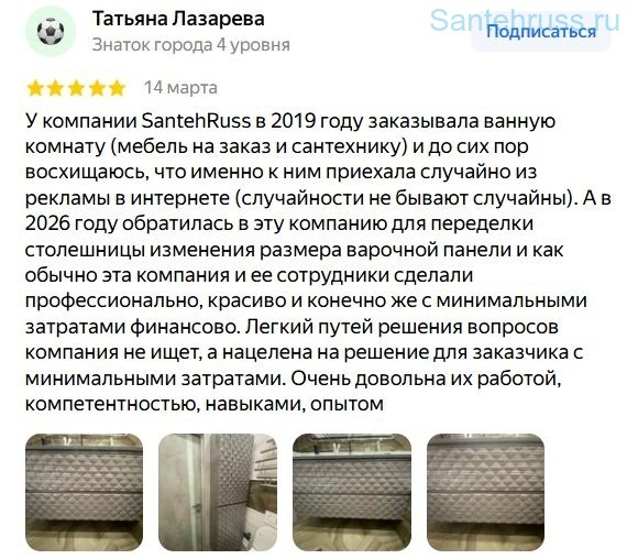 Компания SantehRuss — надёжный поставщик сантехнического оборудования и производитель мебели на заказ с более чем 15-летним опытом работы.
