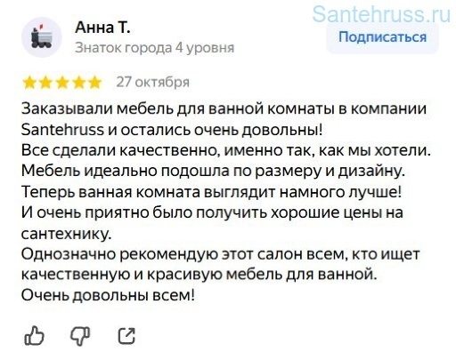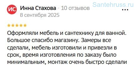 В ассортименте интернет-магазина SantehRuss более 20 тысяч наименований сантехники и мебели для любого бюджета. Наши менеджеры всегда готовы помочь вам подобрать и приобрести товар без лишних усилий и временных затрат, обеспечивая оперативную обработку заказов и профессиональное обслуживание.